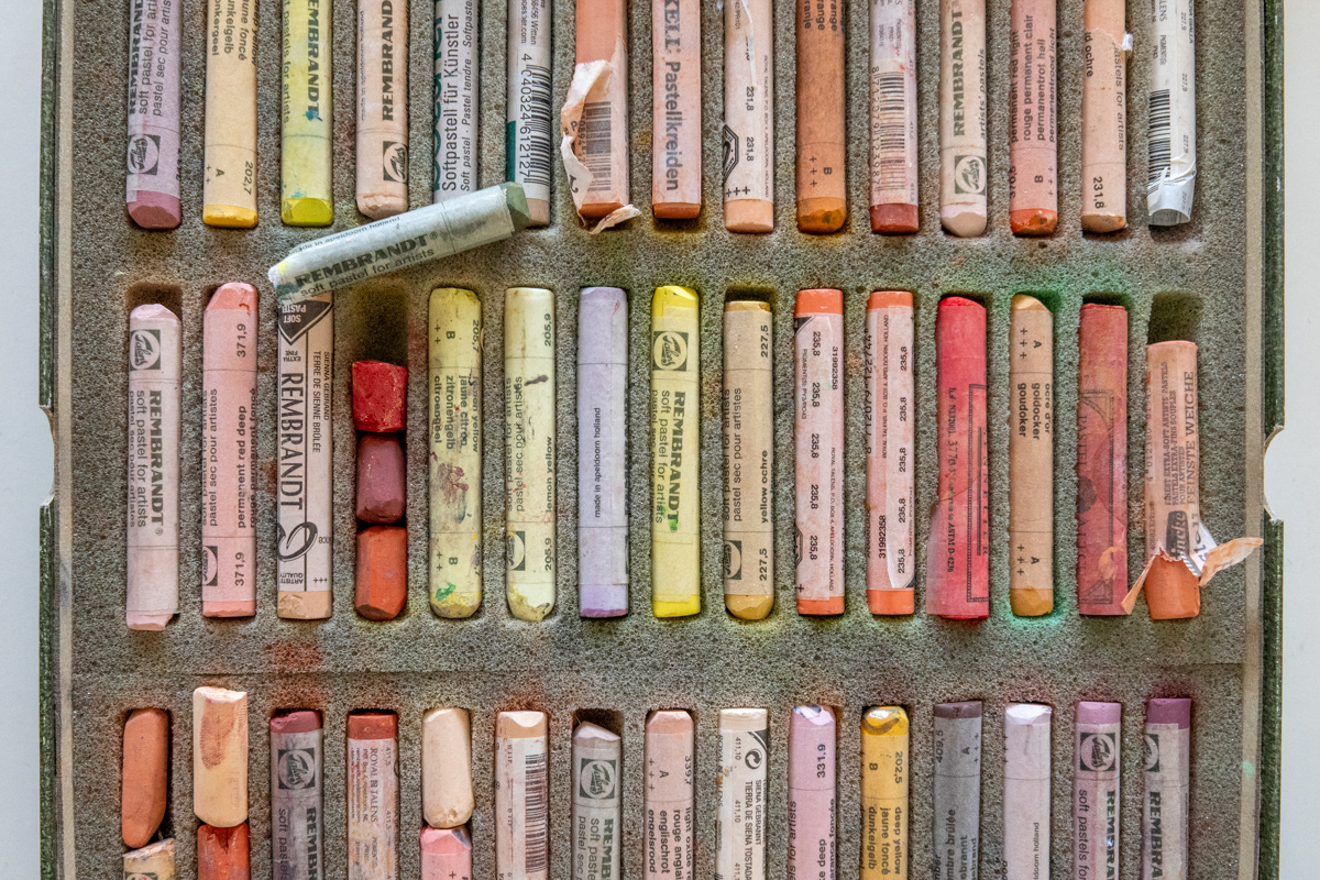 My soft pastel works, for example, are created in a very calm, often seated, and lengthy process. My fingers are the tools: layer by layer, I rub the pigment into the coarse paper until its pores are closed. I’m very close to the image – for me, there is no greater intimacy with color or with the work itself than here. The powder settles deep into my fingertips, and sometimes I have to stop because the friction makes them hurt. Everything about it is fragile, soft, and requires the utmost care. Working on the printing press, on the other hand, is much more hectic and requires a different kind of strength. I’m constantly in motion, moving through different steps and stations in my studio – I’m always on the go.