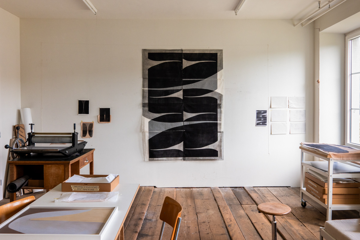 First of all, I try to keep things as minimal as possible when it comes to furniture. Although that’s not really true anymore, since it’s actually already quite full. What I mean is that only a few pieces have a fixed and permanent place—like the shelf that serves as the backdrop for my archive, or the metal racks. Everything else is mobile and constantly in motion, depending on what I’m working on at the time. I think the white space — or empty space, the free area — is very important to me. It’s important for me not to be too distracted; I always need a certain calm around me. I can see this same tendency in my artistic work as well. Balance, and the way spaces and surfaces are divided, is something that runs throughout my practice — the positive and the negative. What interests me most is the space that emerges through deliberate omission, or the surface that remains untouched.